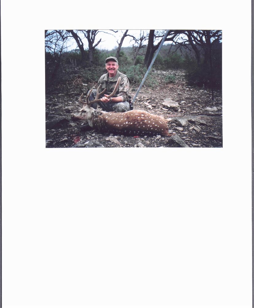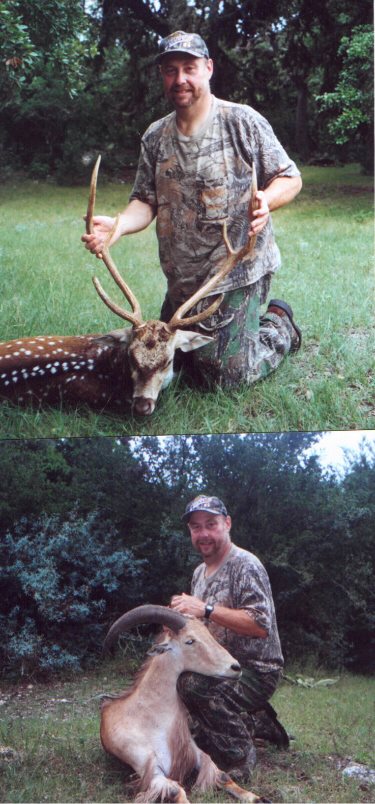 SEE PICTURES IN OUR GALLERY BY CLICKING ON THE FOLLOWING LINKS. An Axis Herd in the Pecan Bottom in May Big Man Defeats Big Boar Hog in month of February Deceptive Beauty--a Horsecrippler Cactus in Full Bloom on the Ranch in April Mr. Mighty is gone but not forgotten: some of our aoudad rams carry his genes today! Heir to the Throne: A King-Size Axis Buck Idaho Lady Nimrod and Her Large Russian Boar Taken in September" The Big One that Didn't Get Away: Record Book Size Russian Boar Taken in June Room with a view--turkey gobblers out the Ranch kitchen window in January February axis buck taken by Illinois hunter in the Looney Box Canyon This hunter drove all the way from Ohio to take this fine aoudad in the Looney Box Canyon An exceptional 10 Pt. Whitetail taken at the North Slope Blind Typical 8-point whitetail taken at the Windmill Blind Father-son duo after successful turkey hunt at the Pecan Bottom Blind Rio Grande Turkey in the cactus patch, taken during spring turkey hunt West VA. hunter with axis buck and aoudad ram taken in July Big Axis buck in velvet, taken in the month of March
